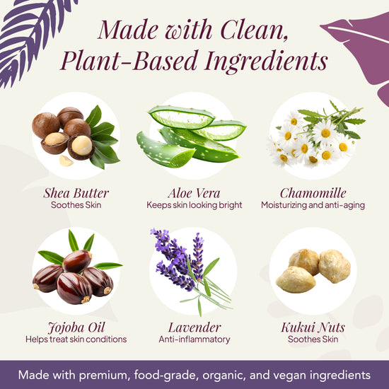 All-natural, minimally-processed plant-based ingredients. We never use parabens or chemicals of any kind.