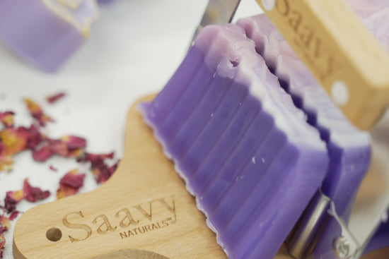 Each set includes one full 1-pound Plumeria Violet artisan soap loaf, a natural beechwood cutting board, and a stainless steel wavy slicer for elegant, boutique-style soap slices every time.