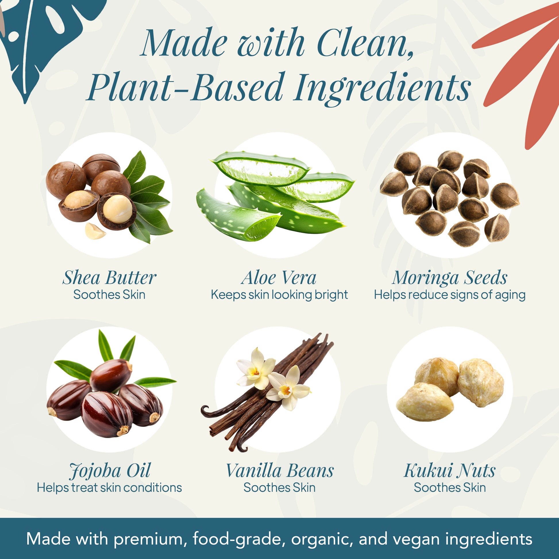 Turn a trip to the sink into a mini holiday. Our Tahitian Vanilla Hand Wash transports you to a relaxing hammock in a tropical oasis. Our handpicked mix of pure Jojoba, Aloe and Shea Butter enriched with pure botanical extracts leaves your hands feeling divine. All without chemicals, additives, or artificial ingredients.